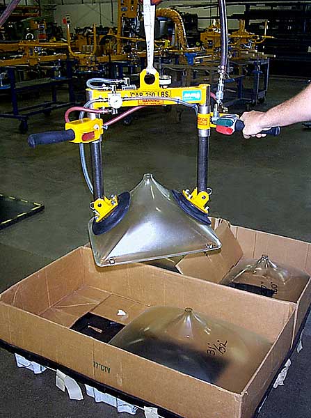 VM和VB系列真空吸吊機(jī)是高度集成的單人操作真空搬運(yùn)輔助系統(tǒng), 適用于透氣、半透氣和不透氣物體。 依靠真空吸盤來吸附物體, 通過電動(dòng)或氣動(dòng)葫蘆來提升物體。 系統(tǒng)操作簡單, 安全可靠。VH系列真空吸吊機(jī)具有以下特點(diǎn):  故障率低, 維護(hù)簡單  集成設(shè)計(jì), 最大提升高度2.8米, 最大提升重量500公斤  操作簡單, 通過控制面板來上升、下降和釋放  持續(xù)吸附, 真空泵持續(xù)工作, 物體可長時(shí)間被吸附。  頂部空間小, 僅需要73厘米頂部空間  可選用雙速或無極變速電動(dòng)葫蘆  多功能, 根據(jù)不同物體可更換不同吸盤  應(yīng)用廣泛, 不管什么物體, 透氣、半透氣、不透氣物體都可應(yīng)用