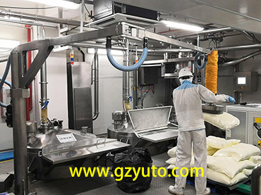 改進后的折臂吊采用了304不銹鋼材質、隱藏式管線和真空泵消音罩。 空間更加簡潔, 杜絕了空氣管外露積塵對食品的潛在污染。轉軸位置增加了護板,防止手指夾傷,提高了設備安全性。真空泵消音罩有效隔絕噪音,并且更容易清潔, 杜絕粉塵堆積和細菌繁殖。