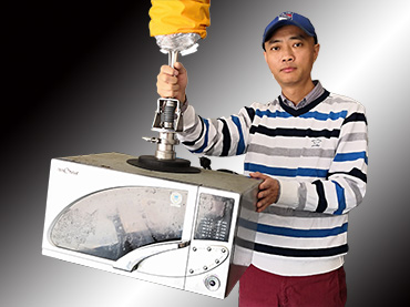照片中的單手操作真空搬運(yùn)機(jī)型號(hào)為VTSH140, 提升高度1.7米,最大提升能力60公斤, 性能上超過(guò)任何進(jìn)口品牌。 吸盤(pán)連接器標(biāo)配90°彎頭, 可吸附從垂直到水平放置的物體。 同時(shí)配有快速轉(zhuǎn)換接頭, 可根據(jù)物體大小和形狀快速更換多種吸盤(pán)。